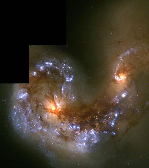 the cores of the two galaxies. The sweeping spiral-like patterns, traced by bright blue